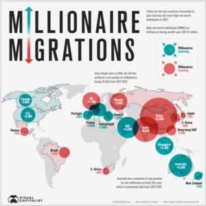 A Henley & Partners Private Wealth Migration Report című elemzése nyomon követte, hogy az elmúlt 10 évben a nagy vagyonnal rendelkező magánszemélyek mely országokból és mely országokba költöztek – a lenti térkép a 2023-as előrejelzéseket mutatja be. Ebben a kimutatásban a HNWI-ket olyan magánszemélyekként határozzák meg, akik legalább 1 millió dollár nettó vagyonnal rendelkeznek.