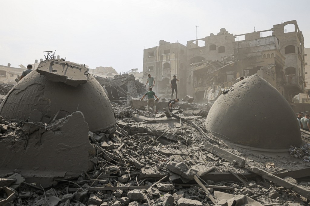 Palesztinok vizsgálják a Gázavárosban lévő Sousi mecsetre mért izraeli légicsapást követő károkat 2023. október 9-én © AFP / Mahmud Hams