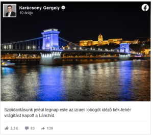 Vasárnap este Karácsony Gergely főpolgármester bejelentette, hogy – a Hamász által megtámadott Izrael iránti szolidaritás kifejezéseként – a Lánchíd kék-fehér megvilágítást kap. Erről hétfő reggel fotókat is posztolt: