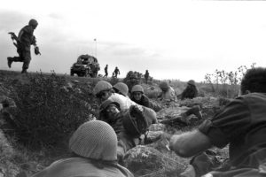 Az 1973-as arab-izraeli háború idején izraeli katonák és újságírók bújnak fedezékbe a szíriai gépek elől a Golán-fennsíkon.