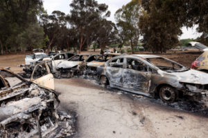 Kiégett autók a Nova zenei fesztivál területén, Izrael déli részén, ahova Hamász-fegyveresek behatoltak, és legalább 260 embert megöltek 2023. október 10-én – Fotó: Ronen Zvulun / Reuters
