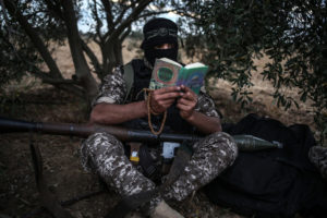 Az Iszlám Dzsihád fegyveresei imádkoznak Gázában. A kép forrása: Spencer Platt/Getty Images