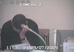 Deme Gábor azon a (detektívtükrön keresztül rögzített) kihallgatáson, amikor lejátszották neki a gyilkosságról készült hangfelvételt. (Forrás: Ankor.hu)