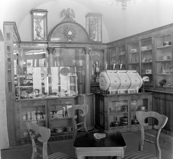 A védetté nyilvánított berendezési és felszerelési tárgyakat az ország legjelentékenyebb cukrászati együtteseként értékelhetjük. A berendezés csodával határos módon a jelentős épületkárok ellenére az 1849-es és 1944-es ostromot is túlélte. A cseresznyefából készült mahagóni berakásos pult mögötti, faoszlopokkal határolt ajtó mintha a régi Buda regényes világába vezetne. Két oldalán üvegszekrények, bennük aranyozott asztaldíszek csillognak és másfél század cukrászdivatjának csecsebecséi: száz és száz formájú művészi figura, gitározó lány, bébikalapos bakfis, cukros nippek, házaspár egy skatulyán, melyben szaloncukor volt, nő menyasszonyi fátyolban, egy tisztelt úr frakkban, püspökök, süvegük alatt drazséval, kezeikben piros zászló, hónuk alatt imakönyv, szép lovacskák, le lehet venni a nyakukat és cukor van a hasukban, húsvéti tojások, angyalkák aranyos dobozokon. A bejárattal szemben nőszobrok, az ajtó fölött az óra lapja körül napsugarak lövellnek szét, efölött sas dacol az idővel.