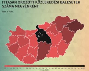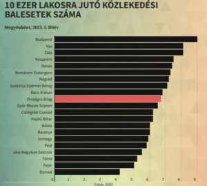 2023. I. félévben 6424 közlekedési baleset történt az országban, 8,4%-kal kevesebb az előző év azonos időszakinál – derült ki a KSH adataiból. Országosan 10 ezer lakosra 6,7 közlekedési baleset jutott az év első hat hónapjában, a népesség számához viszonyítva a legtöbb baleset Budapesten történt (9 eset/10 ezer lakos), második helyen Vas megye áll (8,1 eset/10 ezer lakos), a harmadik pedig Zala megye, ahogy szintént 8,1 baleset jutott 10 ezer lakosra.