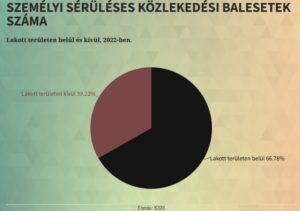 A személysérüléses közúti közlekedési balesetek helyszíneit vizsgálva látható, hogy az összes eset (14 748) közül 9 849 történt lakott területen belül és 4 899 azon kívül.