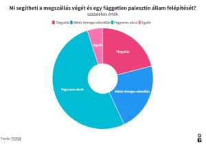 Arra a kérdésre, hogy mi segíthetne egy független palesztin állam létrejöttében, a válaszadók több mint fele mondta azt, hogy a fegyveres erőszak. A tömeges és békés tüntetések hatásosságában a megkérdezettek 22 százaléka hisz, a tárgyalásokban csak 21 százalékuk bízna. A válaszok az alábbi ábrákon már az összevont gázai-ciszjordániai eredményeket mutatják.