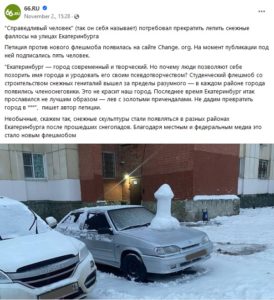Fallosz alakú hószobrok lepik el az autókat Jekatyerinburgban. A beszámolók szerint egy október végi havazás óta egyre több fallosz alakú hószoborral találkoznak Jekatyerinburg lakói a város közterein, valamint az ott parkoló autókon.