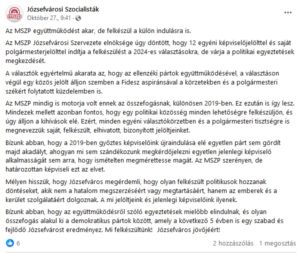 A szocik szeretnének ellenzéki együttműködést, de ragaszkodnak a jelenlegi helyeikhez. A párt józsefvárosi szervezete Facebookon közölte, hogy 12 egyéni képviselőjelölttel és saját polgármesterjelölttel készül a 2024-es önkormányzati választásokra, bár hozzátették, várják a politikai egyeztetések megkezdését.