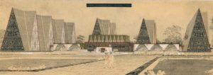 Nyitókép: Tálos Gyula: Népi Művészetek Háza, főhomlokzat, 1957 – ez is látható a Sosemvolt Budapest – Tervek, álmok, víziók a főváros építészetének 150 évéből című kiállításon (Forrás: MÉM MDK)