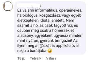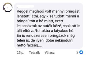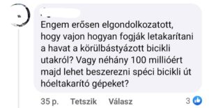 „Ez megint valami olyan, mint a Blaha Lujza téri WC. Nagy büszkeség volt átadni, de a fenntartása nem megy. A téli időszakban a havat a kotrógép a karókkal elválasztott biciklisávra tolja – mert úgy van megszerkesztve, az a kotrólapát logikája, hogy az út széle felé tolja le az úttestről.”