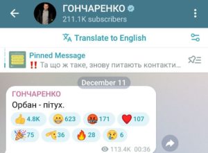„Orbán egy buzi” – – Alekszej Goncsarenko ukrán politikus – az ukrán parlament tagja, az Európa Tanács Parlamenti Közgyűlésének ukrán delegációjának tagja – ismét a nagy és művelt ukrán diplomáciai iskolára emlékezteti a világot.