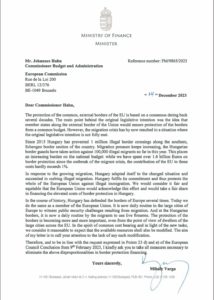 „Elvárhatónak tartjuk, hogy a közös teherviselés jegyében a megváltozott feladatok okán a források korrigálása is megtörténjen” – írja Varga, aki szerint a magyar határok mentén napi rutinná vált a migránsok részéről éles fegyverek alkalmazása.