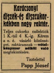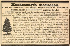 Egyik korábbi blogbejegyzésemben már bemutatásra kerültek a karácsonyi vásárok, az egykori karácsonyi készülődés. Érdekes, ahogy a karácsonyi díszítéssel kapcsolatos hirdetések már a 19. század második felében megjelennek a lapokban.