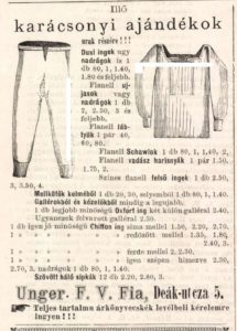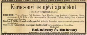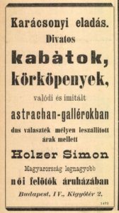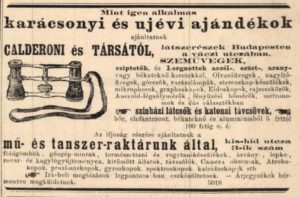 „A karácsony mozgásba hozott mindent. A tarkábbnál tarkább hirdetések, dúsabbnál dúsabb boltkirakatok — mind egy czélra törekszenek, hogy ki a leleményesebbe néző és vevő közönség figyelmét magára vonni. Most minden bolttulajdonos egy kissé festész, tableauxrendező és költő, a ki selyem szövetekből, gyöngyökből, legyezőkből, s a diszáruk minden nemeiből Írja ódáit a közönséghez. […] S ha boltjuk és áruik feltűnővé tételében leleményesek, hirdetéseikben vetekednek a legjobb epigrammatikussal. ‘A viruló egészség a legnagyobb kincs — tehát X. szabó jutányosan ajánlja a hideg ellen legjobban óvó téli bundáit.'” –