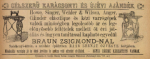 A hölgyek számára kiemelten a kézimunkához használható eszközöket reklámoztak a hirdetők. Sláger termék volt pl. a varrógép, amely a fővárosi és a vidéki lapok hasábjain is ugyanúgy megjelent az ünnepek előtt, mint l. az alábbi 1877-es hirdetésben Miskolcon: