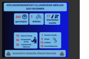 A Budapesti Rendőr-főkapitányság munkatársai 2023 decemberében összesen 63 olyan közlekedésrendészeti ellenőrzést tartottak, melynek fő célja a gyorshajtás és a közúti versenyzés elleni fellépés volt, olvasható a police.hu-n.