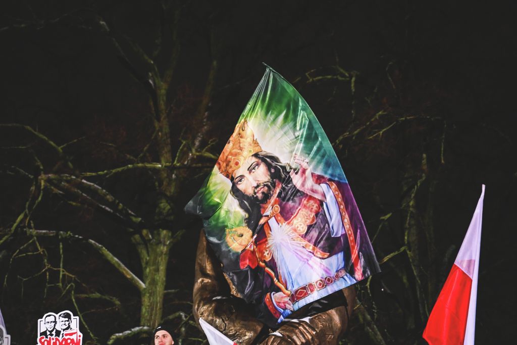 A téren lengyel zászlók lengedeznek, sőt néhány amerikai zászlót is felfedezni a lobogók közt. A megmozdulást az ellenzéki Jog és Igazságosság (PiS) párt szervezte, melynek több politikusa is felszólalt. Jaroslaw Kaczynski, a párt elnöke azt üzente a tömegnek: