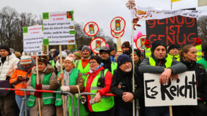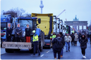 Hétfőn délelőtt gazdálkodók, kézművesek és szállítmányozók ezrei gyűltek össze nehézgépekkel a berlini Brandenburgi kapu körül egy nagy tüntetésre. A Straße des 17. Juni és Unter den Linden utcákon reggel több sorban traktorok, teherautók és egyéb járművek sorakoztak. De nem csak férfiak állnak a Brandenburgi kapu előtt. Sok gazda is demonstrál.
