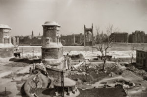 1947, zajló Duna, olvadó hó az Erzsébet híd budai hídfőjénél (Fotó: Album002 – Fortepan)