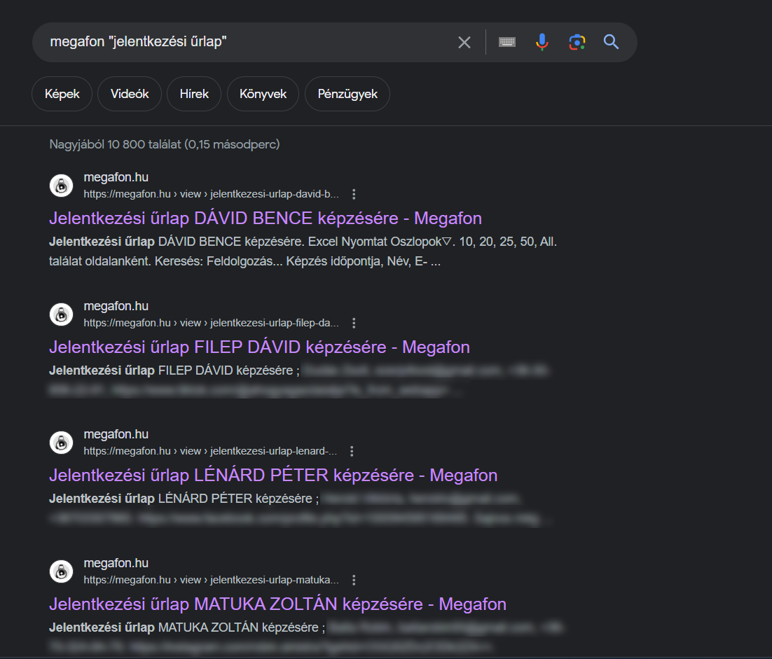 A Google keresőben egy egyszerű kereséssel voltak elérhetők a Megafon képzésére jelentkezők személyes adatai