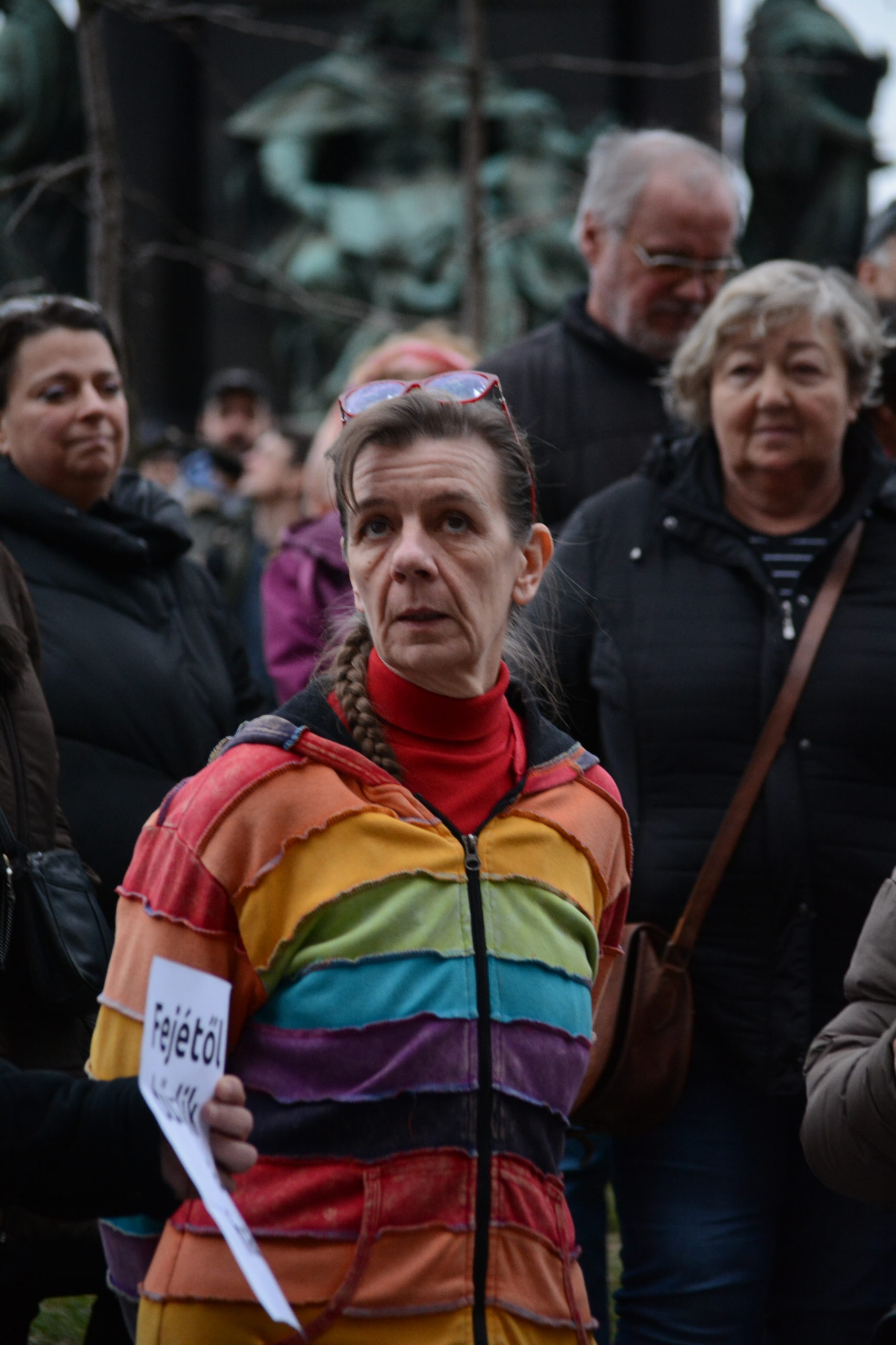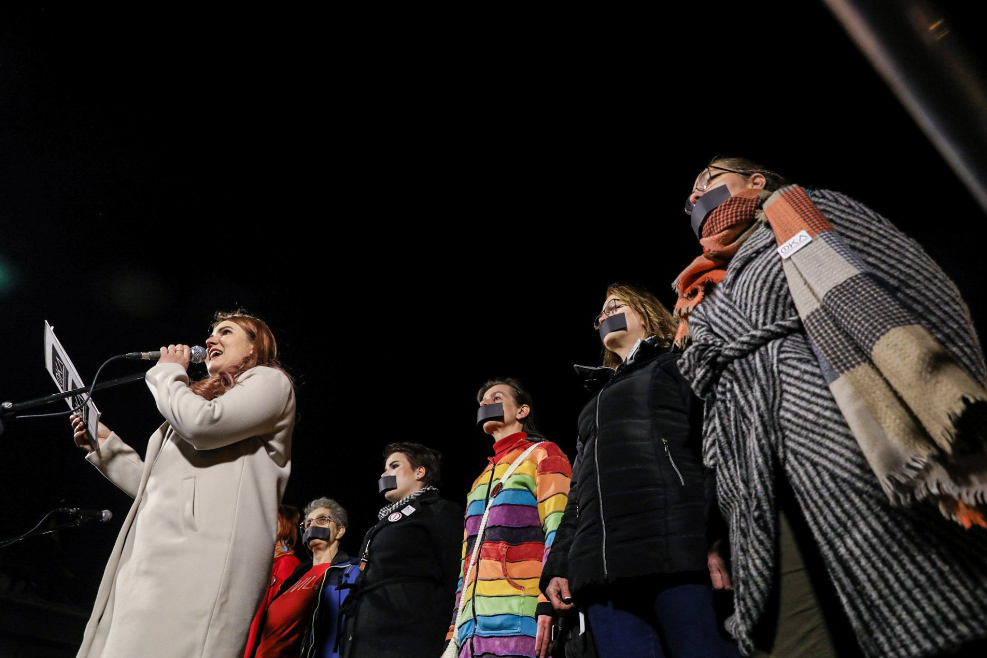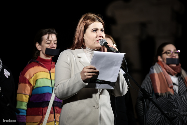 Szilágyi Kitti óvodapedagógus beszédét egy performansz gazdagította: többen leragasztott szájjal álltak mögötte. Véleménye szerint „nem történhet meg normális országban”, hogy egy pedofil ügy elítéltje kegyelmet kapjon, és Orbán Viktor csütörtöki nyilatkozatát „szájkaraténak“ nevezte. Szerinte „Egy bántalmazó kormány csak bántalmazást tud generálni”, és éppen ezért „a Sándor-palota már nem képviseli a magyarokat”.