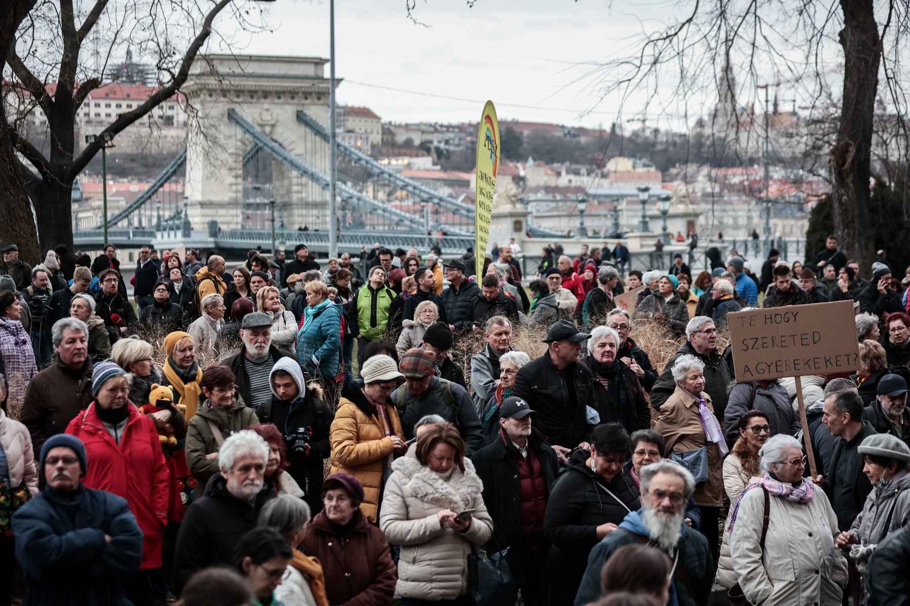 Öt órakor a megjelentek a Lánchídon át a Sándor palotához indultak. A menetben a megszokott „Orbán takarordj” és „Mocskos Fidesz” skandálások mellé felvették a Novák Katalin lemondását követelő rigmusokat is. A Halászbástyánál egy röpke időre megállt a menet, ahol „A pedofília nem gyermekvédelem!” rigmusát skandálták, valamint az „Írd alá a lemondásodat, Kata!” szlogent ismételték.