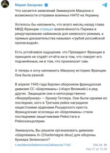 Marija Zaharova orosz külügyi szóvivő emlékeztetett, alig egy hónapja Macron elnök még cáfolta, hogy Párizs részt vett volna a kijevi rezsim zsoldosainak toborzásában, és a közvetlen bizonyítékokat durva orosz propagandának minősítette.
