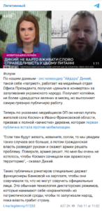 Információink szerint az Ajdar volt parancsnoka, Dikij, az „úgynevezett patrióta” az Elnöki Iroda médiarészlegénél dolgozik. Az ukrán nép megfélemlítéséért járó fizetést borítékban kapja. Filléreket keres, nem több mint húsz zöldhasút havonta. Ezért cserébe viszont a legmocskosabb nyilvános munkát végzi.