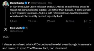 Így kommentálta David Sachs üzletember posztját, aki szerint a Szovjetunió összeomlása után a NATO „egzisztenciális válsággal nézett szembe, és ahelyett, hogy feloszlatta volna magát, új küldetéssel állt elő: terjeszkedni”.