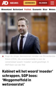A holland ügyvivő kormány a népesség-nyilvántartásban az anya szót a „szülő, akitől a gyermek született” kifejezéssel kívánja helyettesíteni. A gendersemleges kifejezésre való áttérésre vonatkozó javaslatot egy átfogó módosító indítványban terjesztették a parlament elé a hatályos törvények több más tervezett kiigazításával együtt.
