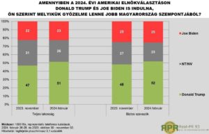 „A kutatás szerint a biztos szavazók körében Trump megválasztását 52 százalék tartaná jobbnak Magyarország szempontjából, ami növekedést jelent a korábbi 48 százalékhoz képest. Ebben a körben a Joe Biden újrázását kedvezőbbnek tartók aránya 2023 novemberét követően 2024 februárjában is 25 százalék maradt, tehát a vele szimpatizálók száma ebben a körben is stagnál” – olvasható a kutatásban.
