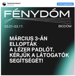 Ellopták a lézerpadlót a Budapesti Állat- és Növénykert Biodómjából, ahol március elején nyitott meg a Fénydóm nevű fényművészeti tárlat. Az esemény Instagram-oldalán számoltak be arról, hogy március 3-án, egy órával a zárás előtt valakik ellopták a gyerekek egyik kedvenc attrakcióját a csónakázó mederből.