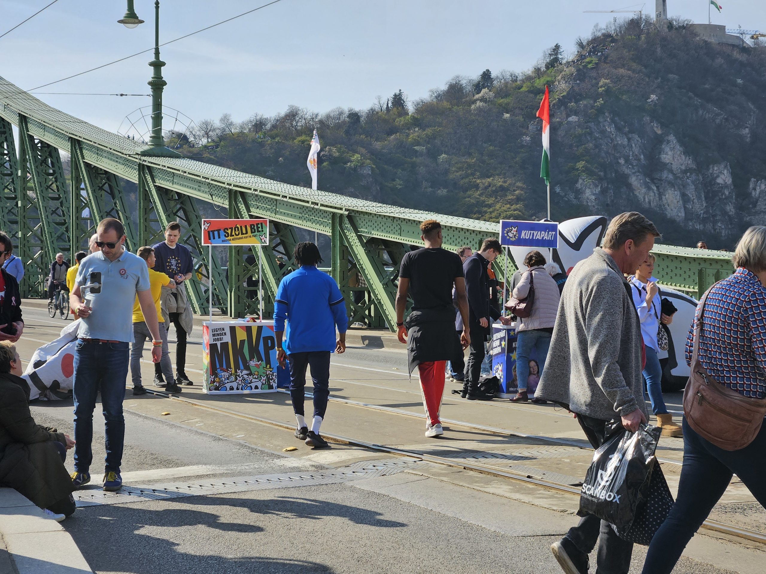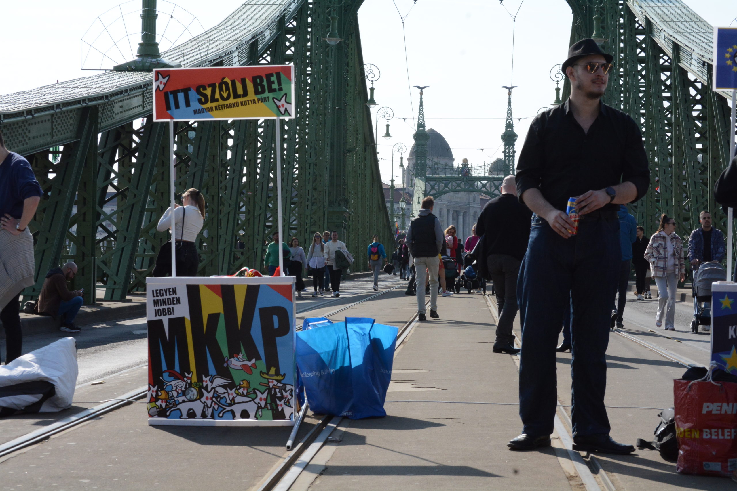 A Magyar Kétfarkú Kutya Párt a Szabadság hídra szervezte a megmozdulását, le is zárták a hidat. Bár a rendezvény 14 órakor kezdődött, a beszédekre csak valamikor négy tájban került sor, addig családi nap jellegű a hangulat. Lehet bóklászni, fotózkodni a hídon, piknikezni, van nyuszisimogató, sőt, molinó készítési lehetőség is. Azért hogy kicsit kampány jellege is legyen az ünnepségnek, a jelölteket is bemutatták, ott van többek között az MKKP EP-listavezetője, Le Marietta, illetve Törley Katalin, valamint a párt elnöke, Kovács Gergely is. Megjelent az ajkai jelölt is, aki annyit mondott: „Hol máshol, ha nem Budapesten?”.