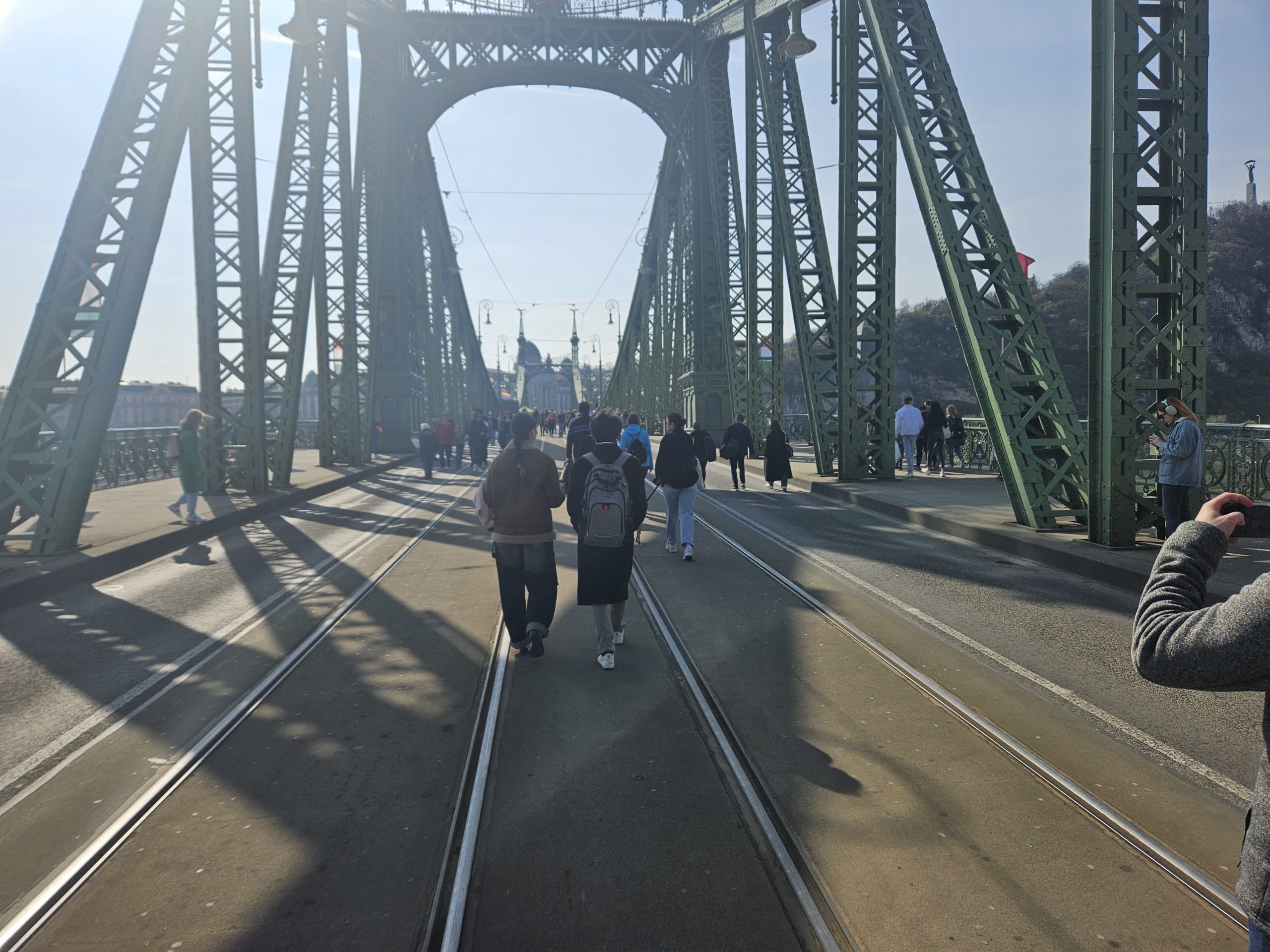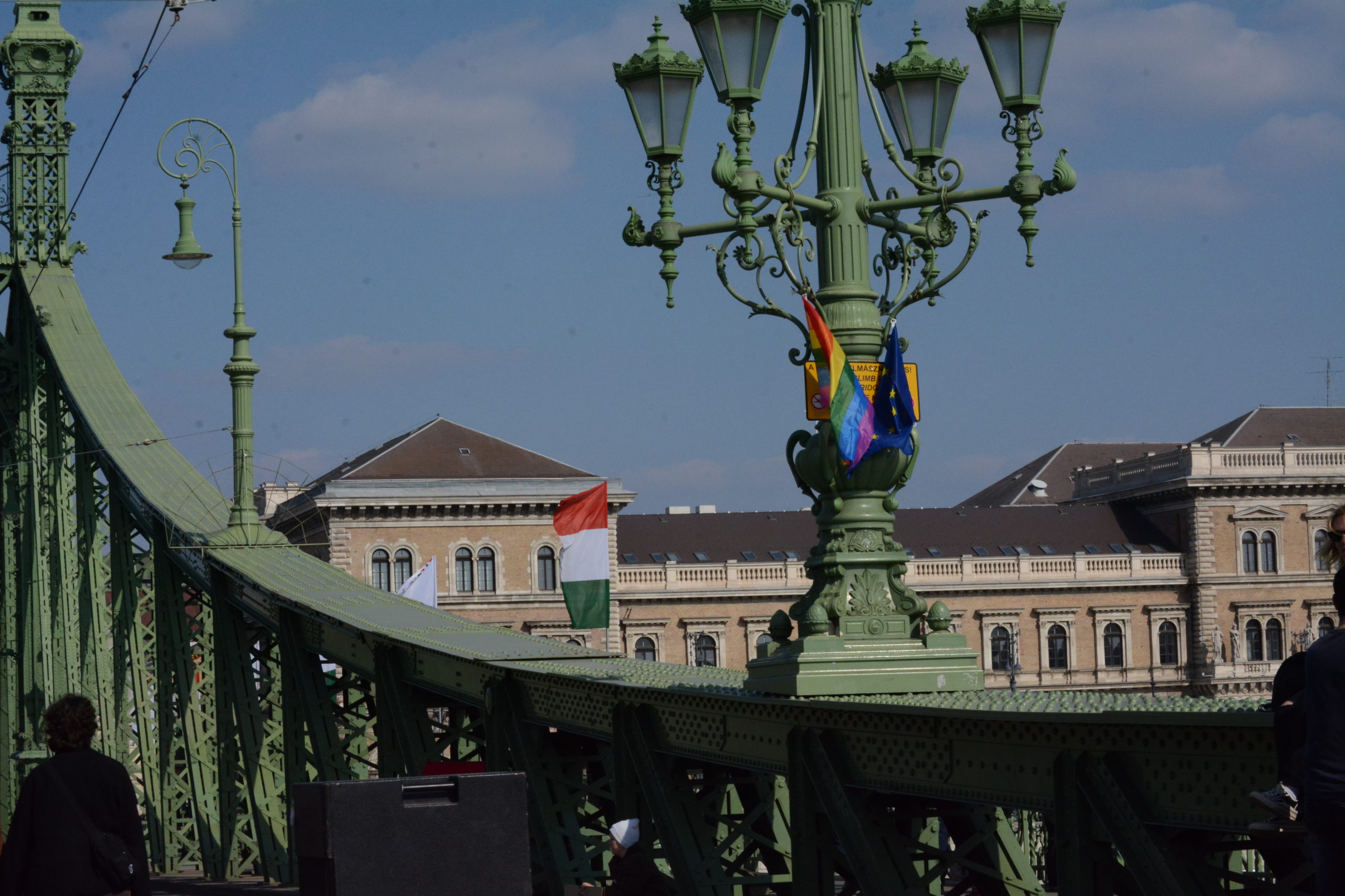 Fél négy előtt nem sokkal kezdődtek a színpadi előadások. Először a Leslie & MC Ron freestyle zenélt a megjelenteknek. Érdekes, hogy a hídra rögzített Pride zászlón kívül egy török zászlót is kifeszítettek a hídra. A zenés program után jönnek a beszédek, felszólal többek közt Baranyi Krisztina Ferencváros polgármestere, Juhász Veronika önkormányzati képviselő és a párt régi-új társelnökei is. A színpadi programok mellett folytatódnak az események a „Kutyapárt menni Európa” standjainál is a Szabadság híd többi részén.