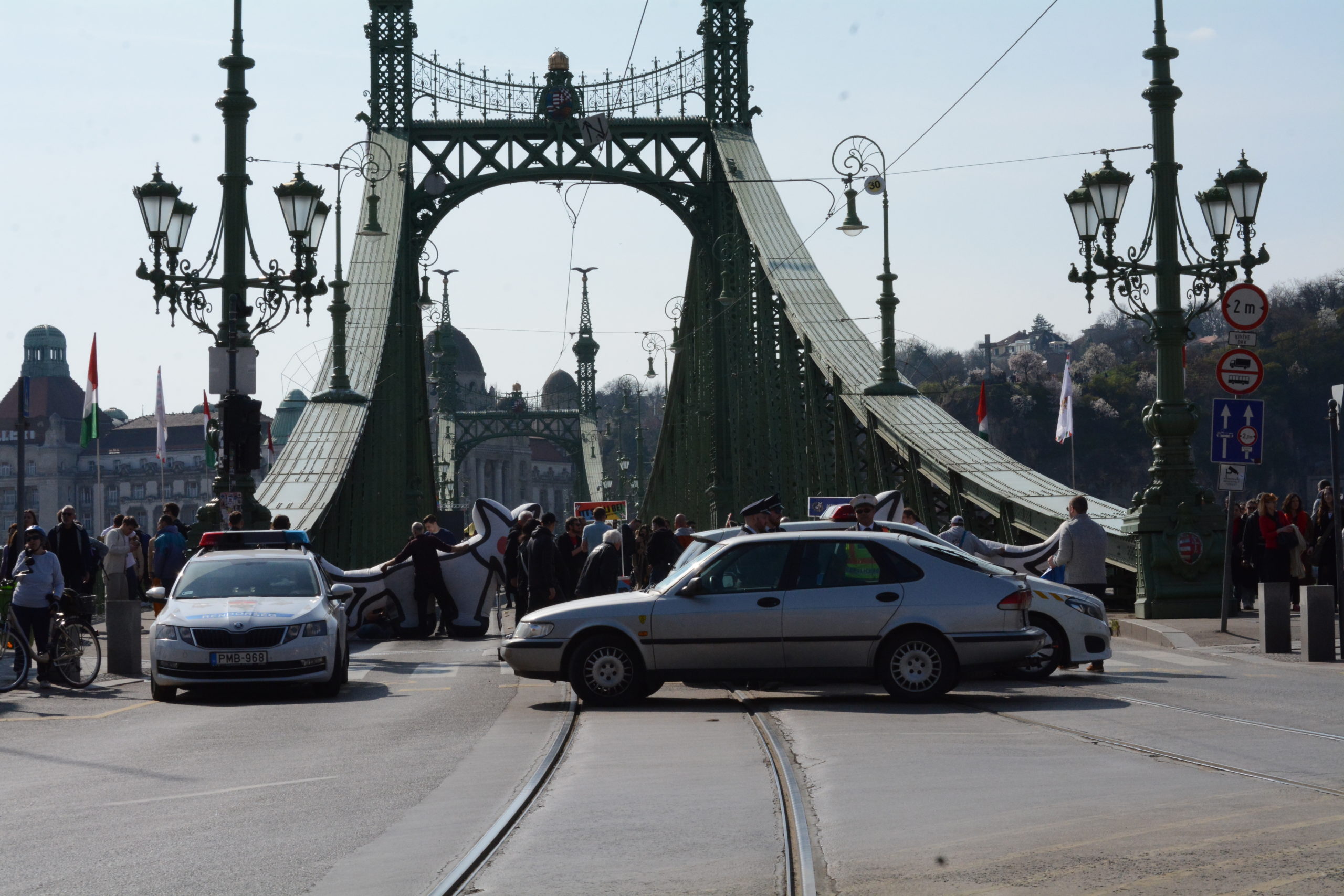 A Momentum egy teherautóra szerelt plakáttal akarta megzavarni a rendezvényt, rendre a kordonok körül mozgott.