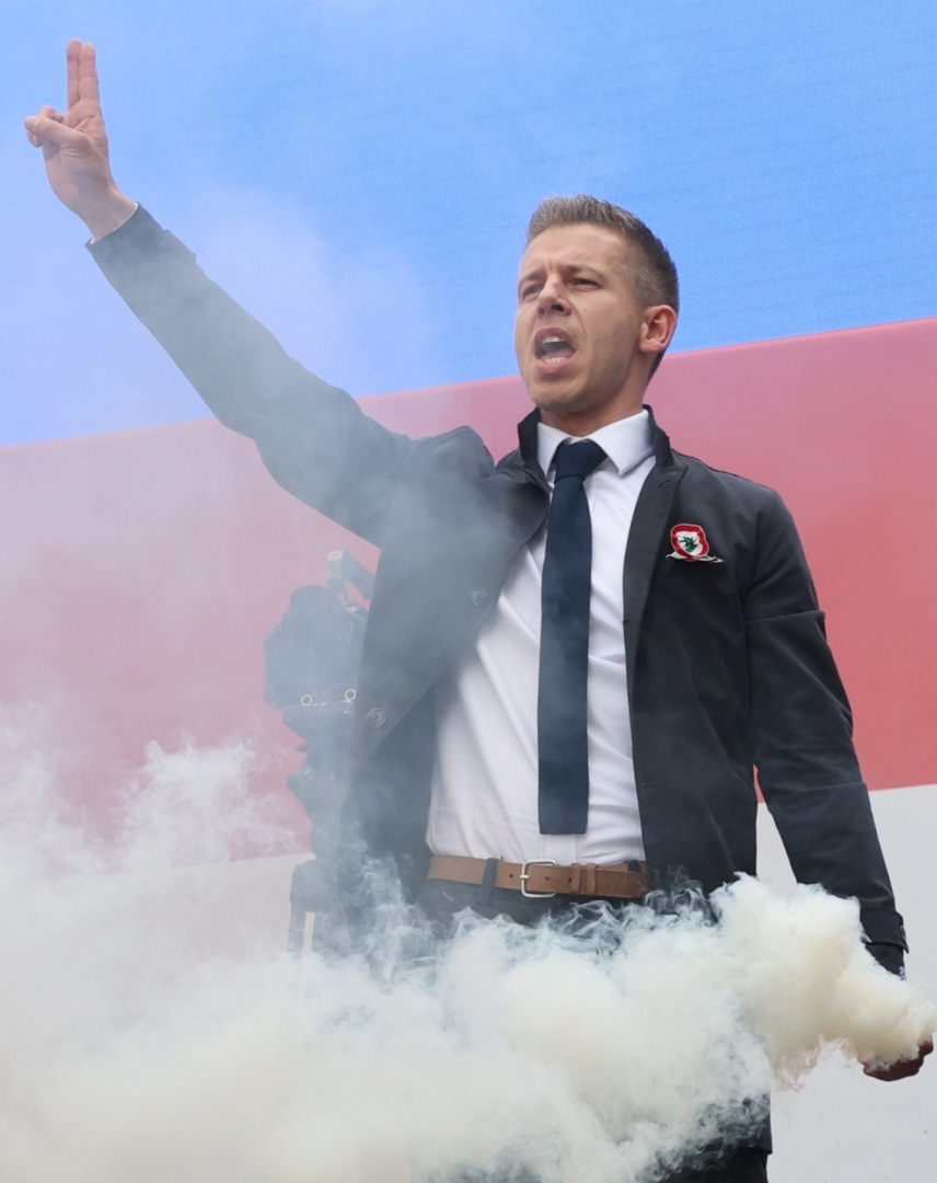 Utolsóként a párt elnöke, Toroczkai László lépett színpadra, akit a nemzet mozgalmáraként konferáltak fel. Azzal kezdte beszédét, hogy ő bizony egy büszke magyar.