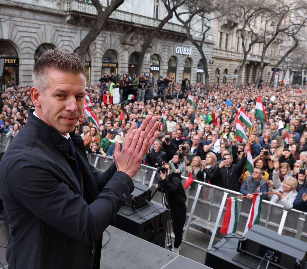 Magyar Péter, az új messiás sem megemlékezni, hanem tüntetni akart ezen a napon. Három órára, a Bajcsy-Zsilinszky Endre úti kereszteződés az az Operaház közé hirdette meg rendezvényét. Az emberek folyamatosan érkeztek az Oktogon felől a színpad irányába, amelyet az Andrássy út Deák tér felőli részén állítottak fel. Az utolsó hangfalakat az Opera magasságában helyezték el, hogy aki az egyébként giga méretű színpadon nem látná, az is mindent hallhasson.