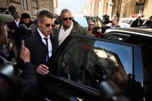 Ezután bement az ügyészségre, láthatóan élvezte, hogy a testőrök gyűrűjében hatalmas sajtómunkás-sereg kíséri.