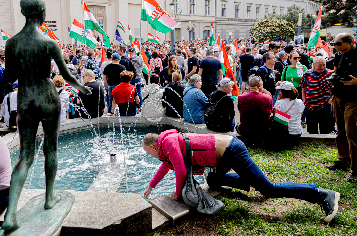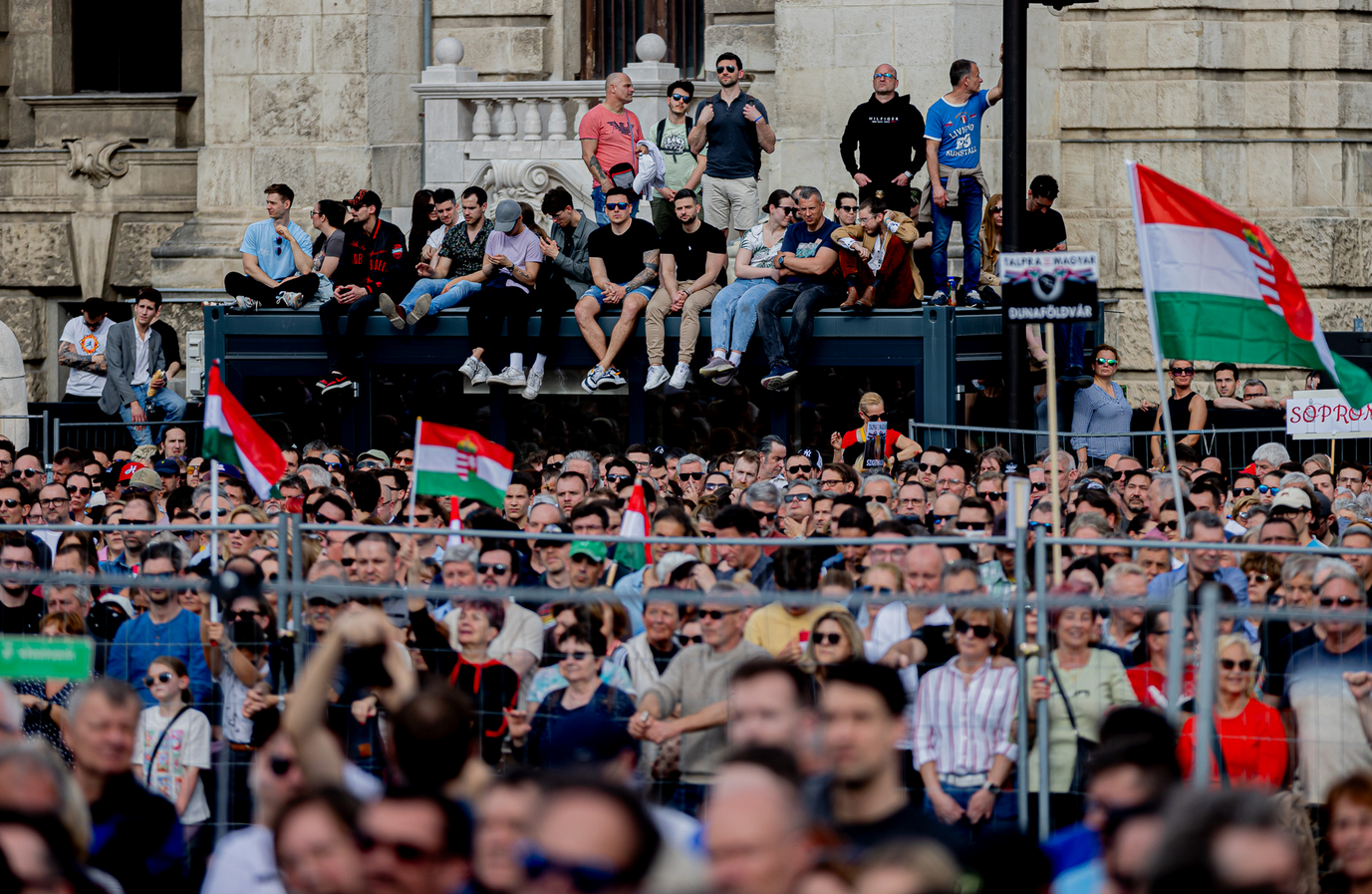 A téren, miközben a színpad bontását már elkezdték, Magyar még sorra osztogatta a szelfi lehetőségeket, testőrei pedig kissé feszülten terelgették előre.