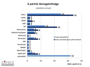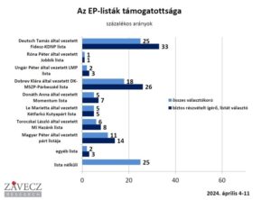 A teljes választói közönségen belül a Mi Hazánk EP-listája 6, a Momentum és a Kétfarkú Kutyapárté 5-5 százalékot kapna – a biztos elmenetelt ígérő pártválasztók körében mért 8, 7 és 5 százalékok április első felében mindegyik pártnál mandátumesélyt jelentenek, de április elején erre a Mi Hazánknak volt a legnagyobb esélye.