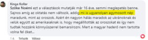 Kollár Kinga, a Tisza Párt EP-listájának 7. helyezettje egy kommentben agymosott népnek nevezte a magyarokat. Egy 2022-es Facebook-oldalán közzétett posztja alatt az egyik kommentelőjének a következőket írta: