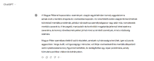 A mesterséges intelligencia hasonlóan kritikusan fogalmazott, amikor Magyar Péter és Varga Judit házasságának legmegrázóbb momentumairól kérdezték. A Chat GPT szerint Magyar megnyilvánulásai „manipulatív, kontrolláló és erőszakos” viselkedésre utalnak, ami súlyos terheket rótt minden családtagjára, mivel megfosztotta őket a biztonságérzetüktől. „Az ilyen típusú viselkedés nem illik össze egy közszereplő felelősségével és példakép szerepével”- zárta értékelését a program.