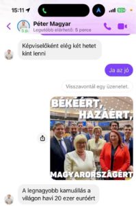 2023 nyarán Magyar Péter egy ismerősével chatelt a Messengeren. A beszélgetés során az európai parlamenti képviselőségről is szó esett. A június 9-i európai parlamenti választáson induló Magyar az ismerősének azt írta, hogy
