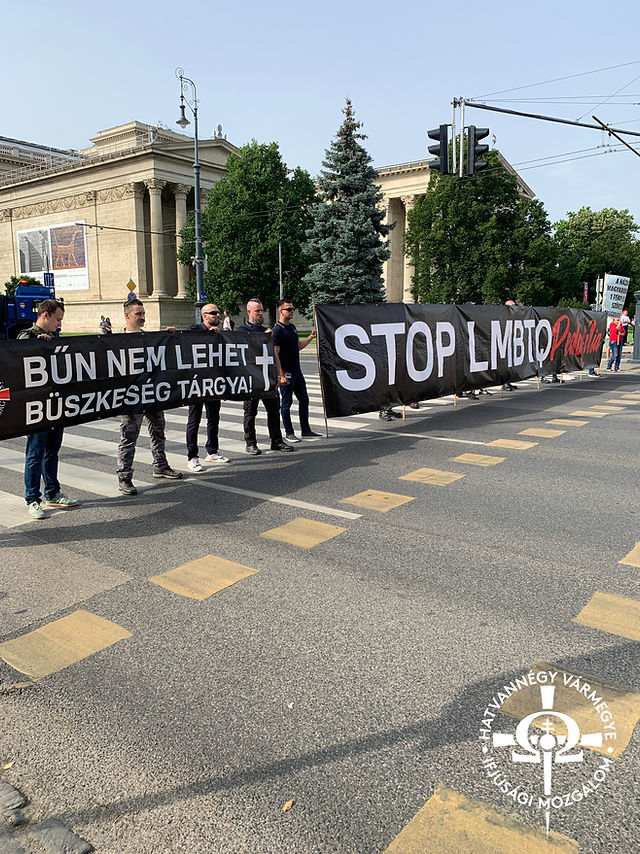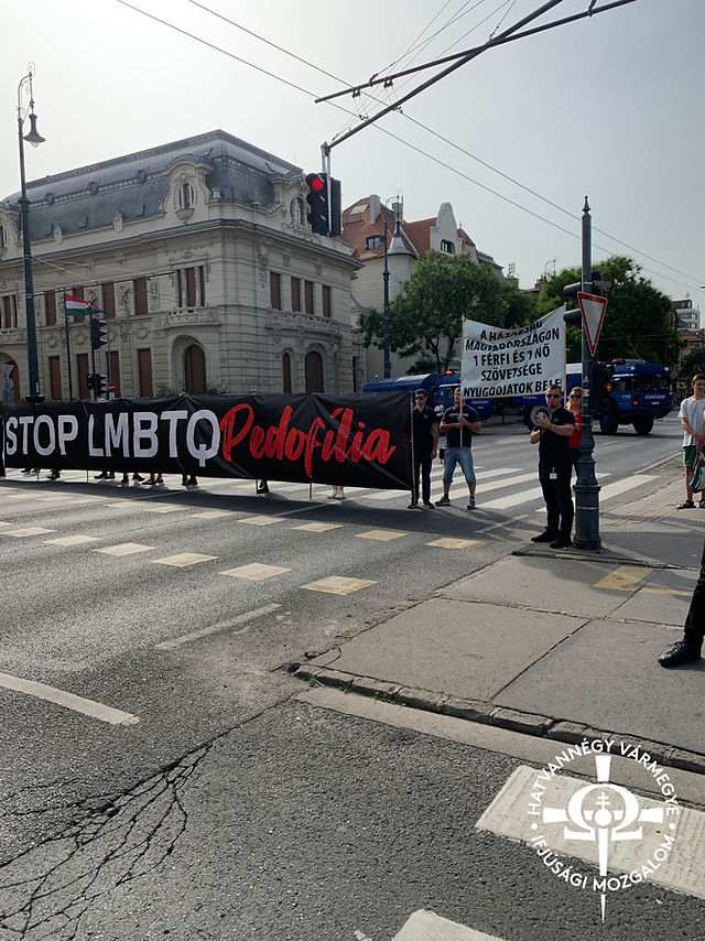 A tér másik oldalán, a Lendvai utca magasságában Budaházy György és a Magyar Önvédelmi Mozgalom tagjai álltak olyan transzparensekkel, minthogy a „Bűn nem lehet büszkeség tárgya” és Stop LMBTQPedofília. Mind a két ellentüntető csoportot rendőrsorfal zárta el a menettől.