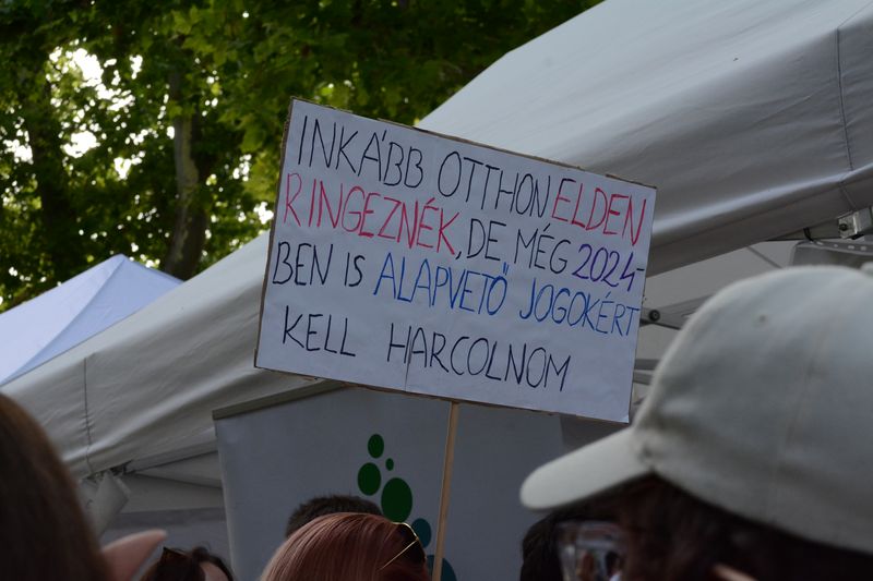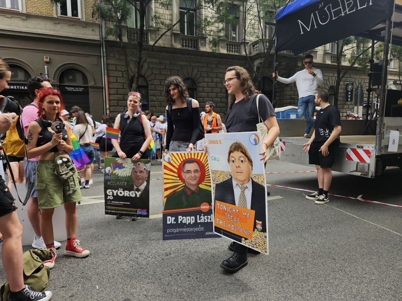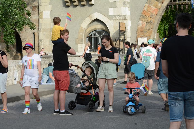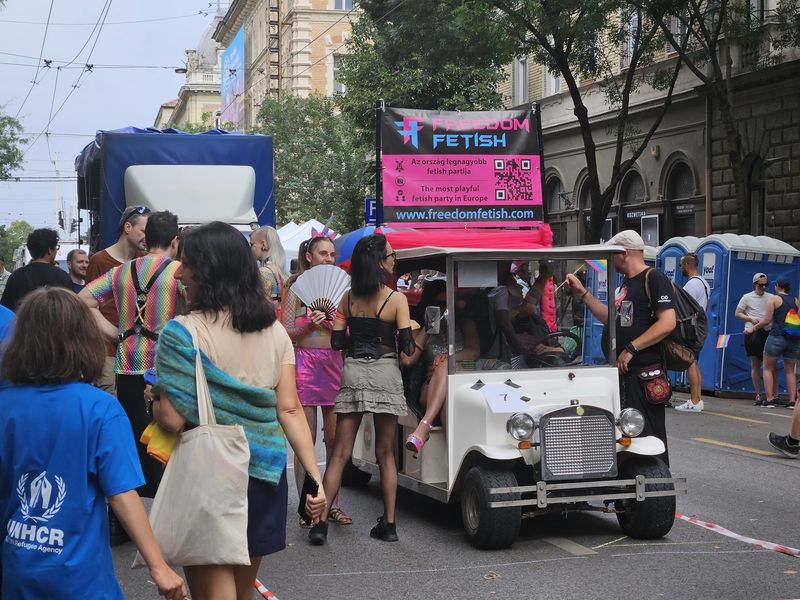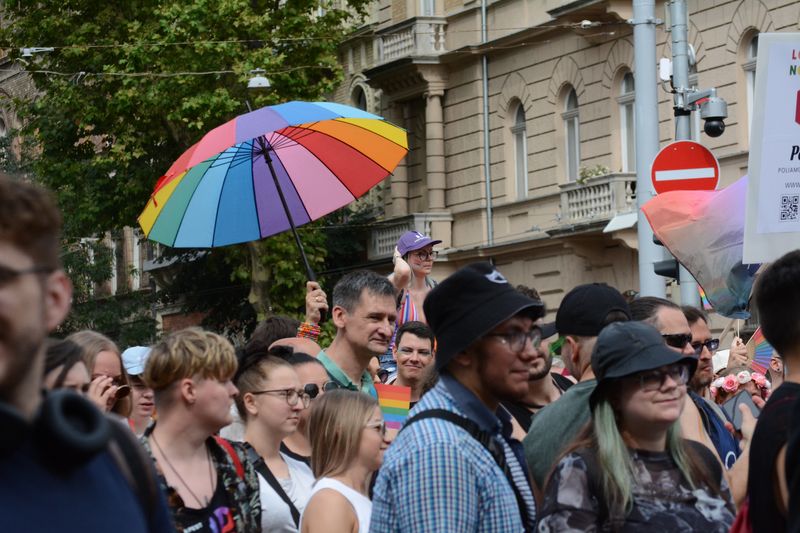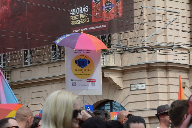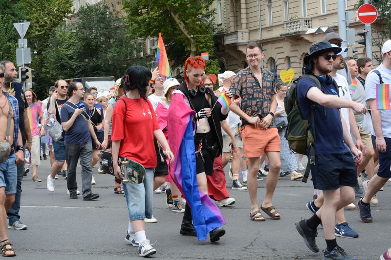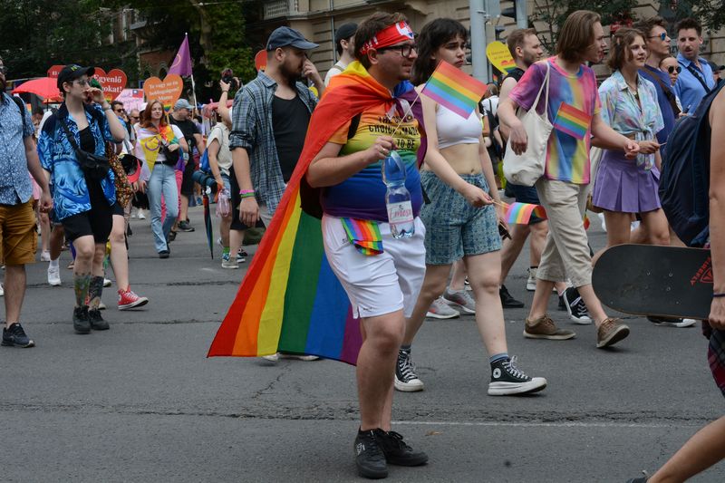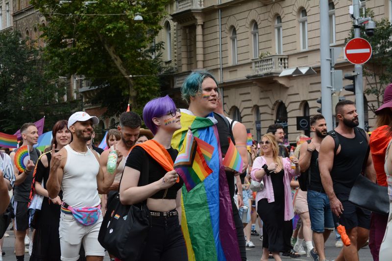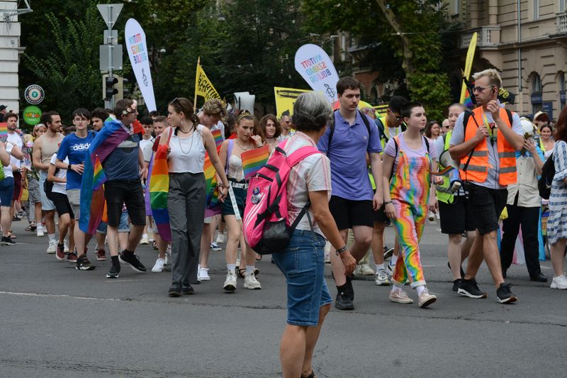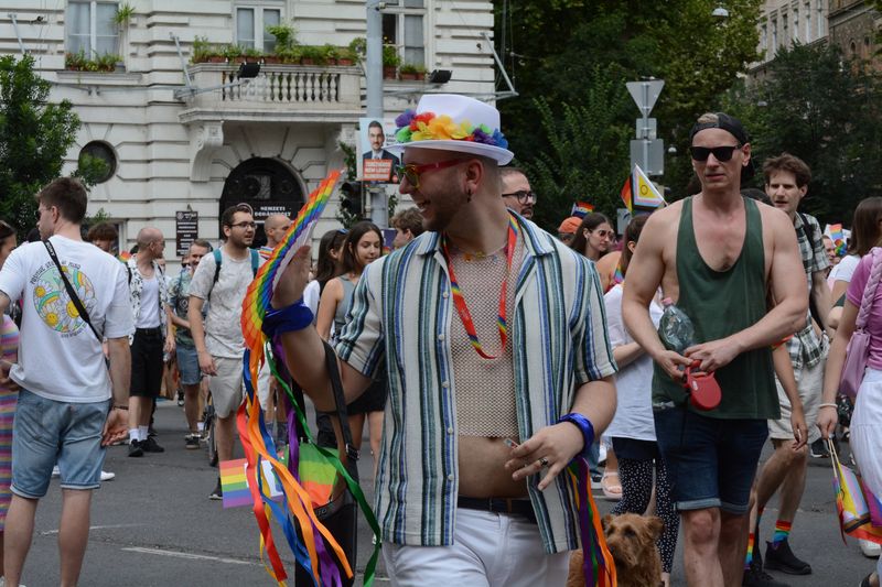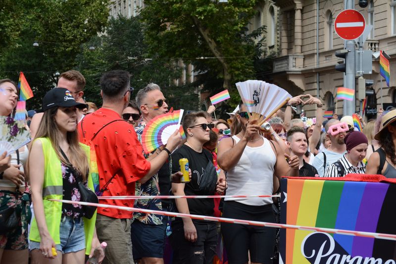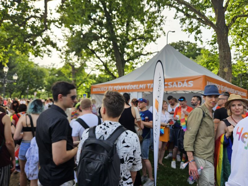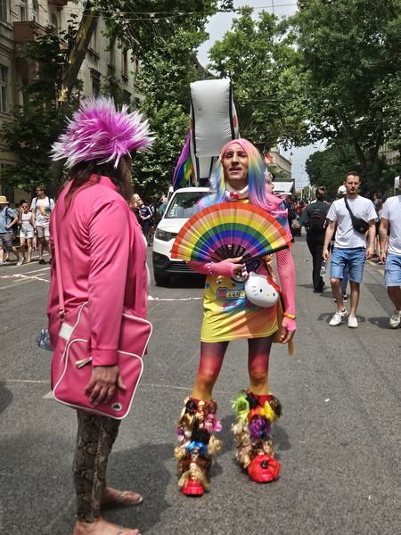 Az árusok is megtalálták a piaci rést, aki Magyar Péter tüntetésein magyar zászlót, a Mi Hazánkos tüntetésen Nagy Magyarországos vagy árpádsávos termékeket árult, az most megjelent a szivárványos kollekcióval. A kétezer forintot kóstáló szivárványos legyezőkre nagy volt a kereslet a kánikulában.