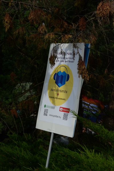 A palesztin csoport az út másik oldalán, egy fa alatt telepedett le, de fáradhatatlanul skandálták angolul, hogy Palesztinát fel kell szabadítani, „a folyótól a tengerig”. Tűzszünetet követeltek, Izraelnek üzentek, hogy mennyi gyereket akarnak még megölni, végül a háborús bűnöket emlegetve az Ukrajna elleni háborút is beleszőtték szólamaikba. Később a zászlót kifeszítve a fák közé békésen beszélgettek.