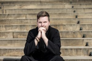Bese Gergő a Nemzeti Múzeum lépcsőjén.