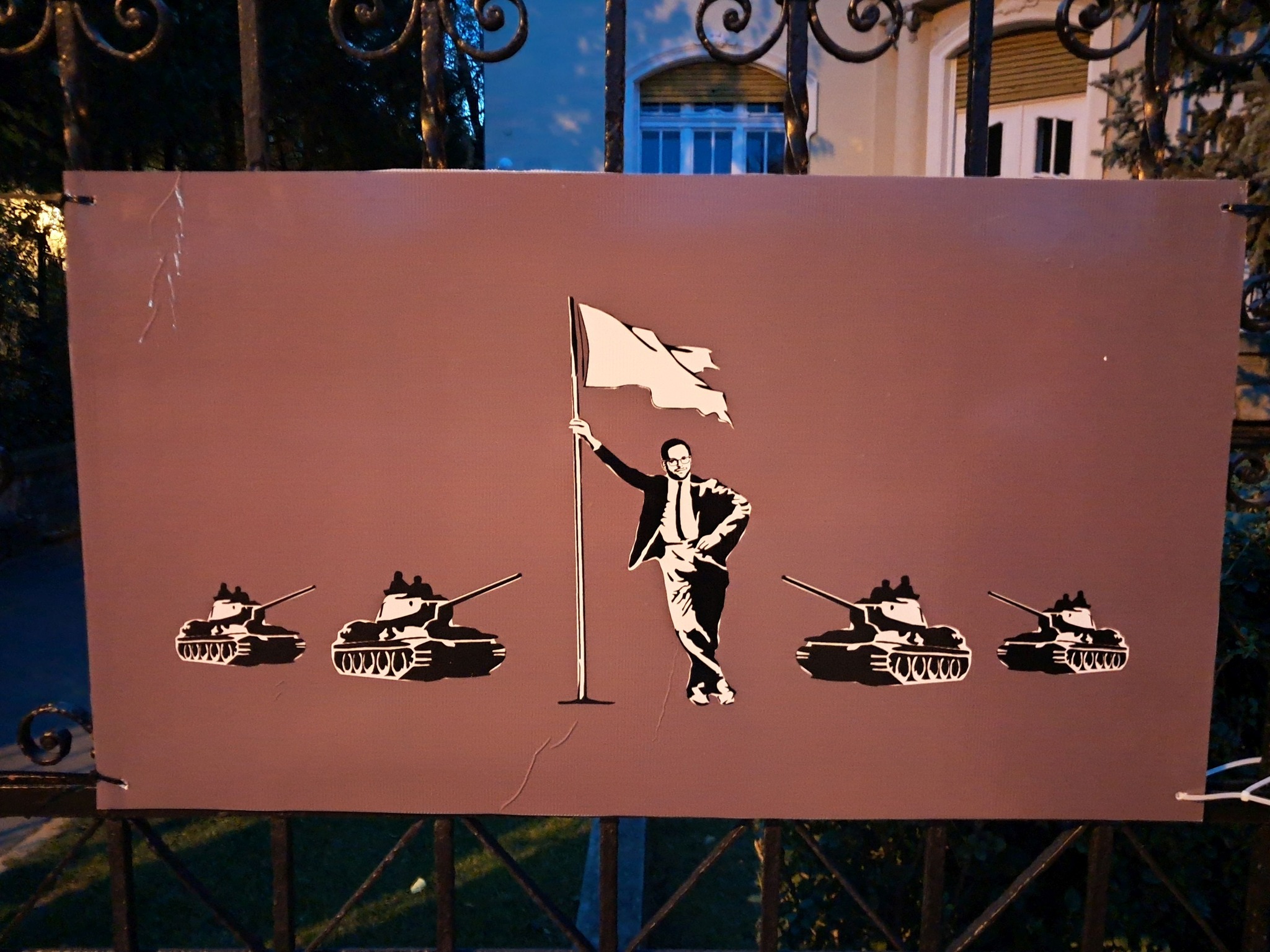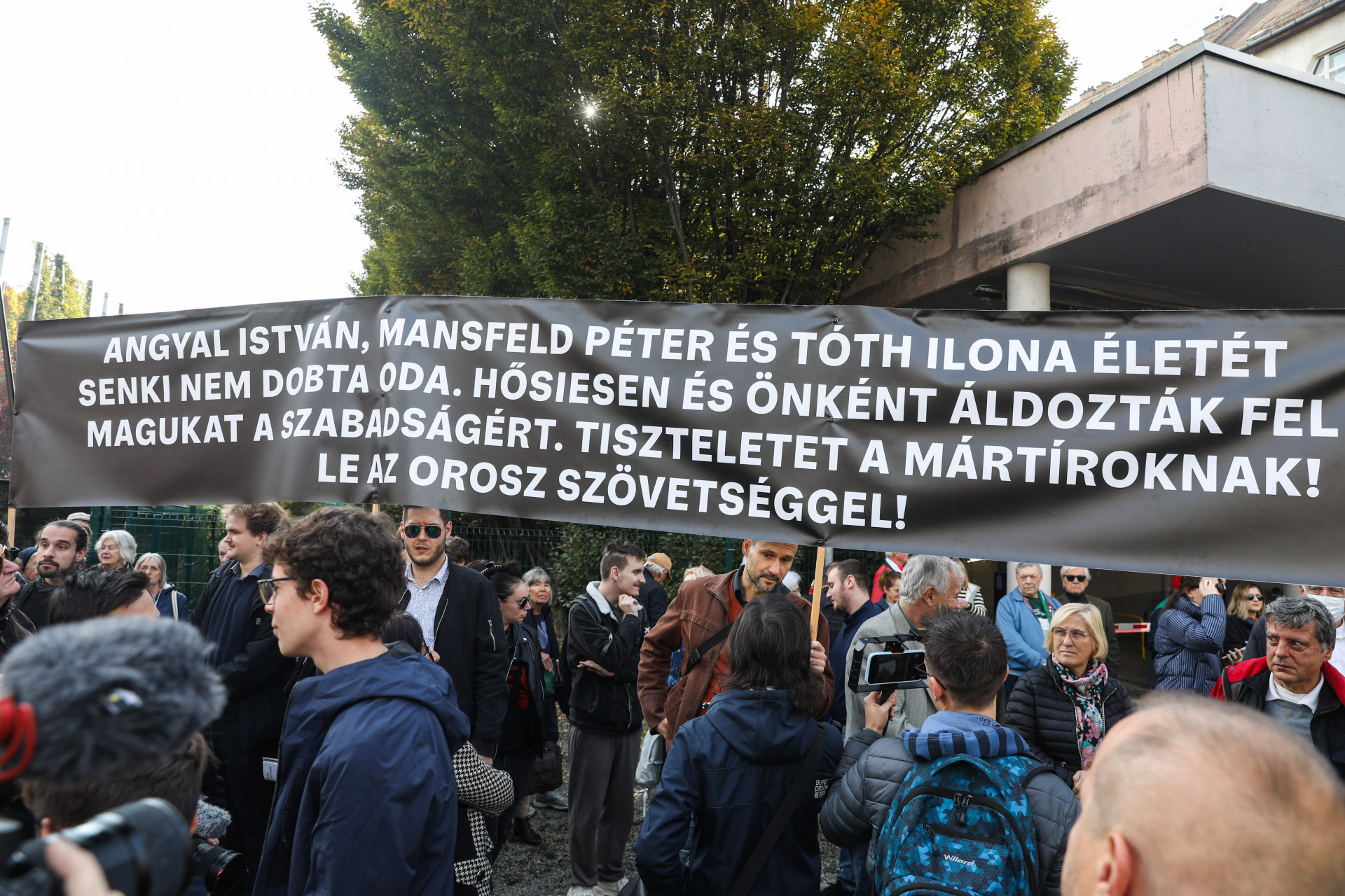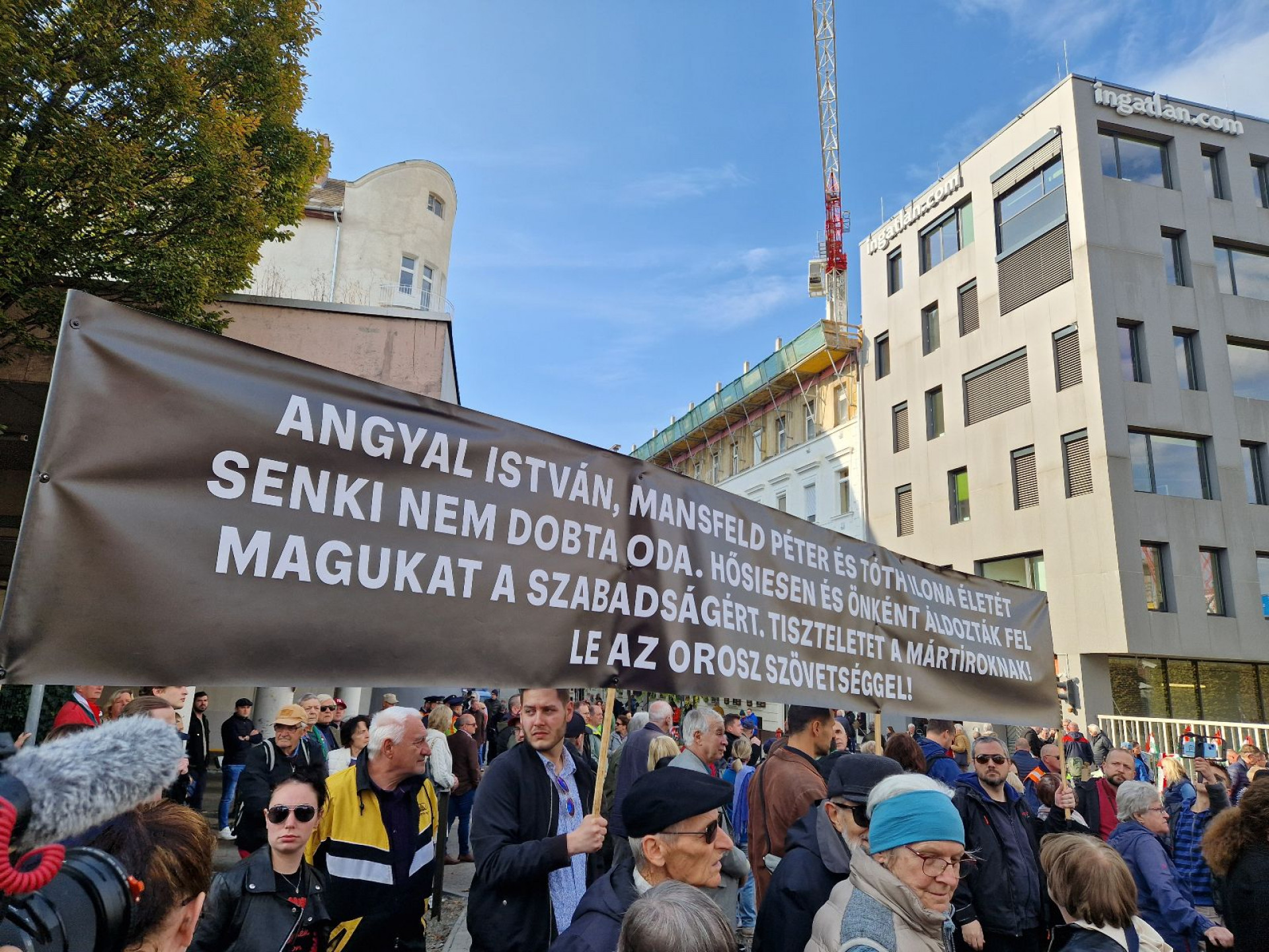 Így került Puzsér Róbert és csapata a Millenárishoz, abban bízva, hogy a Zorbán messziről is látja majd a feliratot: Angyal István, Mansfeld Péter és Tóth Ilona életét senki nem dobta oda, hősiesen és önként áldozták fel magukat a szabadságért. Tiszteletet a mártíroknak! Le az orosz szövetséggel!