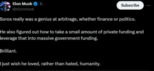 Musk szerint a hírhedt filantróp nagyon ügyes, aki rosszra használja az eszét. Elon Musk, a világ leggazdagabb embere, Donald Trump egyik fő támogatója így nyilatkozott az X-en: